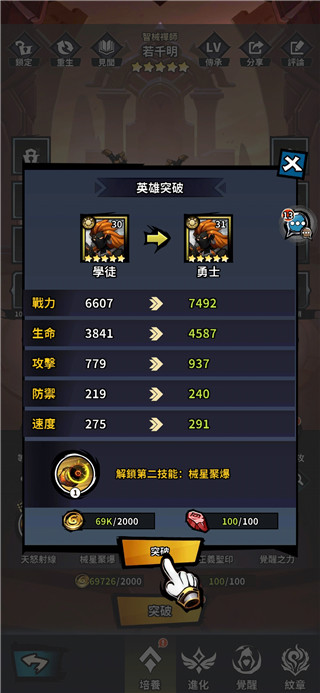 在游戏界面给角色升级,等角色达到满级后就能完成一次突破,而每次突破才是提升角色属性的关键所在。