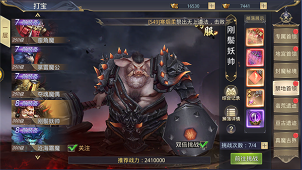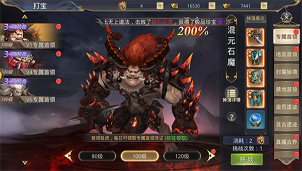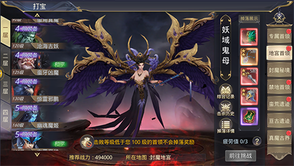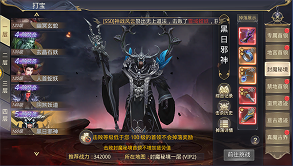 和个人挑战、地宫玩法不同,封魔秘境的挑战次数没有限制,但进入每一层都要满足相应的VIP等级要求;需要注意的是,击杀等级比自己高100级或低100级的BOSS,都无法获得奖励。这里是稀有法宝的核心产出地,也正因如此,会引来不少仙友的争夺——建议大侠组队挑战秘境BOSS,组建强力联盟,防止BOSS被他人抢夺,丰厚奖励可别错过。