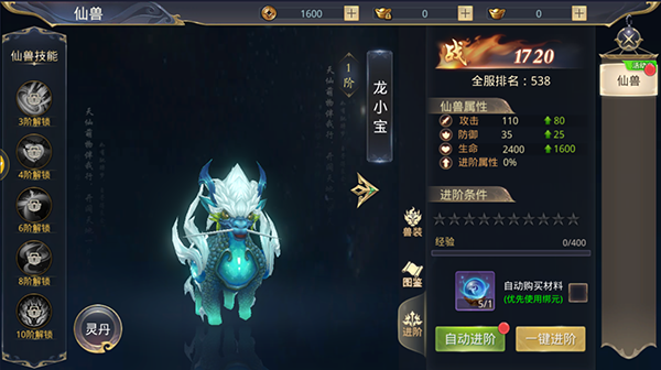 属性:激活仙灵系统后,主角的属性会得到增加,战力也会随之提升;使用成长丹能够培养并升级仙兽,仙兽每提升10级就能进阶1阶。仙兽的阶级越高,不仅能解锁更强大的属性加成,还会拥有更为炫酷的特效。