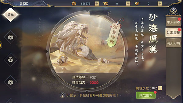 当玩家等级达到73级时,将解锁经验副本“沙海魔巢”。进入该副本后,等级提升速度会显著加快,首日等级突破100级并非难事。每日拥有2次免费挑战机会,建议充分利用完成挑战!