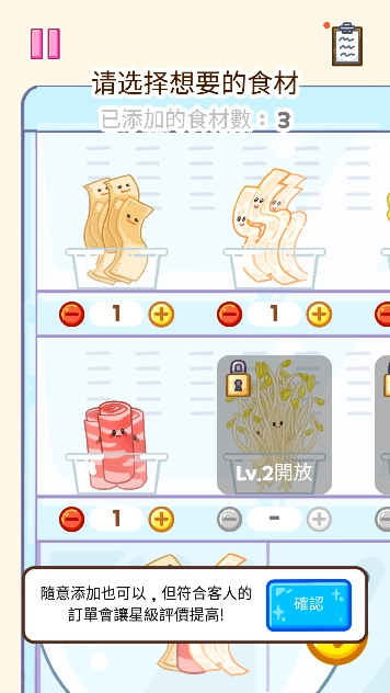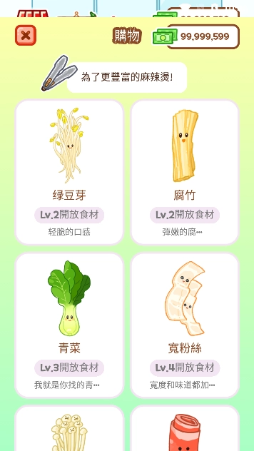 依据顾客的需求,玩家得挑选合适的食材与调味料,制作出可口的麻辣烫。