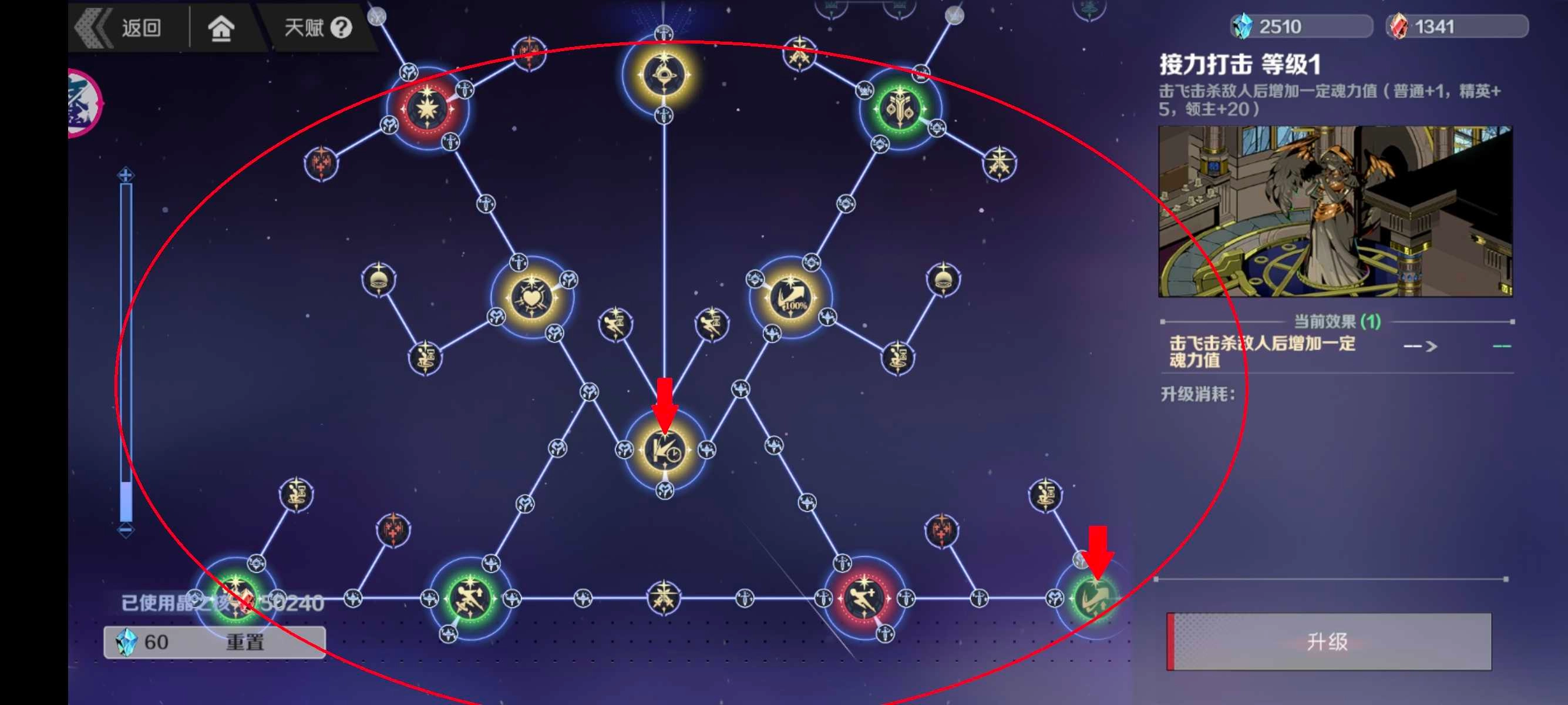 在点选完左上角的对局功能天赋后,我们就可以着手选择并点亮下方的战斗天赋了。这里推荐优先解锁“撞墙后延长定墙时间”以及“极限击飞伤害增加”这两个天赋。完成上述天赋的点选后,剩余的其他天赋根据实际需求进行点亮即可。