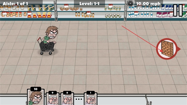处于第一关的场景里,通过滑动屏幕来控制购物车的移动,注意观察右侧砖墙的标识,避开障碍以推进初始关卡的游戏进度。