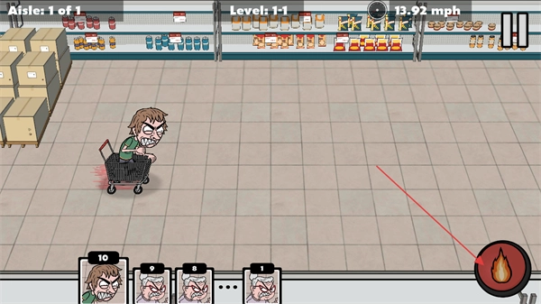 在关卡场景里,购物车的速度为13.92mph,点击右侧的火焰标识按钮,就能让购物车加速移动,从而推进当前关卡的进度。
