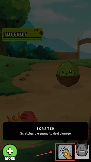 战斗时点击【SCRATCH】技能图标,用抓击攻击敌人【TUFFNUT】,将其击败以推进游戏进程。