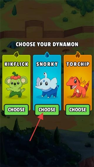 在【CHOOSE-YOUR-DYNAMON】界面,点击【SNORKY】对应的【CHOOSE】按钮,即可选定初始伙伴。