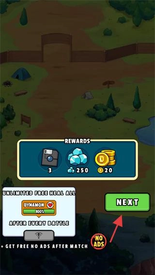 获得对战奖励后,点击【NEXT】按钮,跳过广告提示继续推进游戏流程。