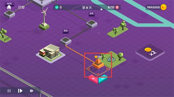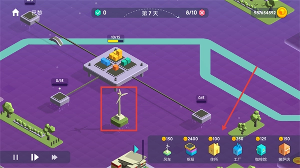 巴黎的场景中,红色框标注出了【风车】建筑,其右侧展示着各建筑的造价,还有箭头指向右侧的资源区。