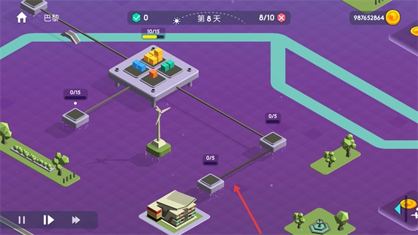 巴黎场景,红色箭头指向线路节点。