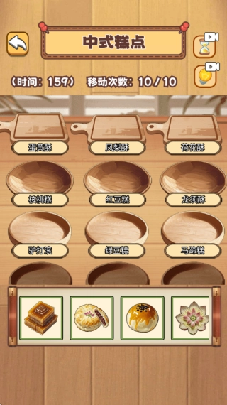 在中式糕点关卡里,玩家得在限定的时间和移动次数内,把画面下方的糕点和上方的糕点名称逐个匹配对应好。