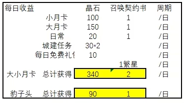 总结:大小月卡的收益相当可观,10连抽需要1500晶石,而每月通过大小月卡能拿到72张召唤券和30张繁星券,加起来总共是102抽,换算下来相当于15300晶石的价值。