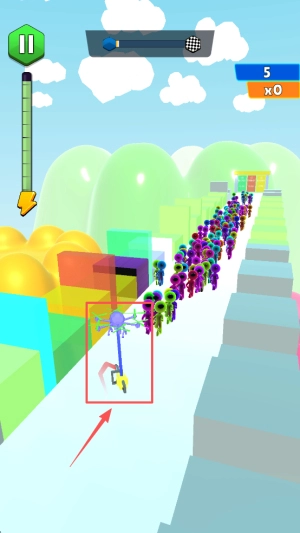 2、操控果冻狂奔:指挥果冻人在赛道上敏捷移动,随时留意头顶飞机的动态,迅速避开掉落或附着的刀具,防止被割伤。