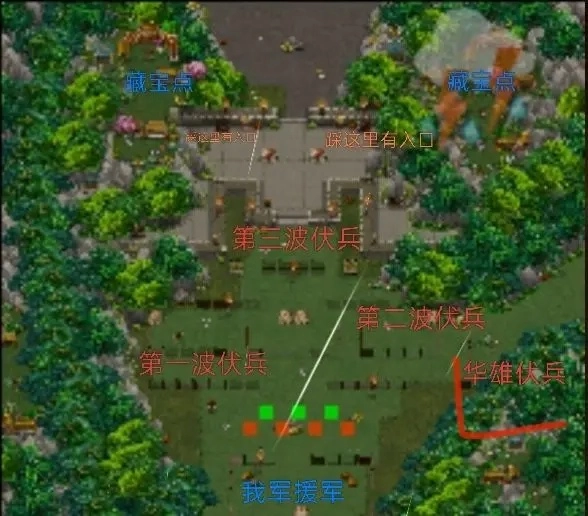 ①兵分两路,先攻取上下两山。此时右侧我方部队不可进入,具体是那两名守门步兵所在位置的前方区域,任何部队进入都会直接撤退。