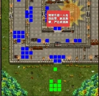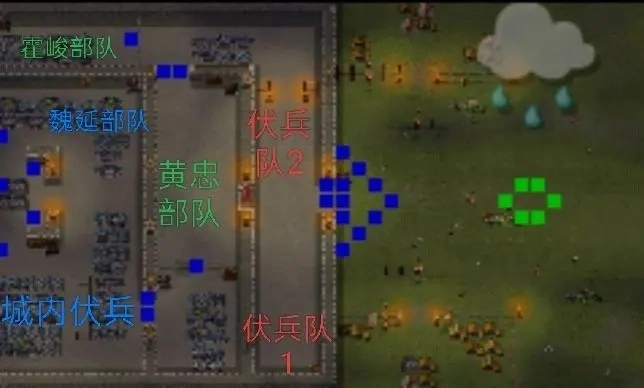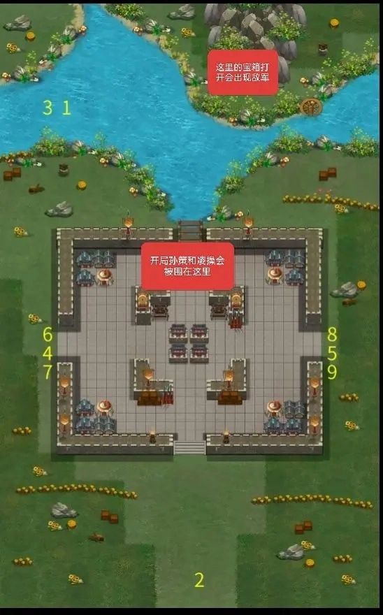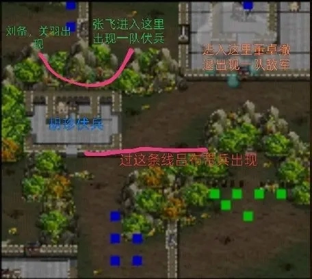 ①我军歼灭对面所有骑兵部队后,孙策若进入(28.13-14)区域的左侧,敌军伏兵便会现身,吕布、张飞等大批敌军将包围我军,同时还会出现两个城门把我军分割开,导致我军全体士气下降。因此,在除孙策外的其他我军成员进入该区域前,孙策切勿提前进入,以防被敌军集火击杀。应先让其他我军人员进入,孙策最后一个进入即可。
