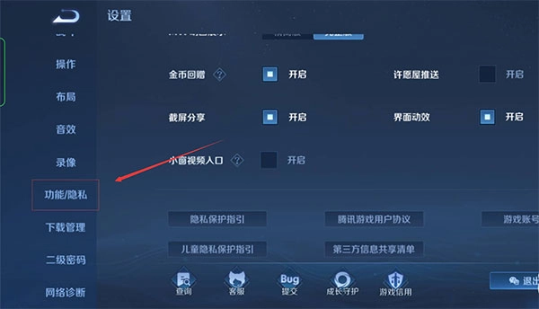 2、在设置中心页面向下滑动,找到并进入“功能/隐私”选项