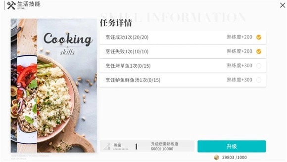 2. 游戏内设有料理、手工、纺织、家具制造、钓鱼、采集这六大生活技能类别。在这些技能里,采集是不耗费精力值的,而精力槽的上限为600,每天都会自动恢复到满值状态。采集能够为其他生活技能供给所需的材料,并且可采集的物品会随着玩家探索进程的推进逐步解锁,等到达第二个世界时就会完全解锁。料理和钓鱼的生活等级提升联系十分紧密,纺织和手工的生活等级提升也密切相关。角色突破时需要的材料,像料理、样本、配件、采集物等,都得通过生活技能来获取。因为提升生活等级要消耗精力,而且投入和回报并不成正比,所以建议优先合成角色突破所需的材料,生活技能可以依据玩家自身的需求来进行升级。