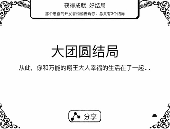 要达成大团圆结局,需在与翔王的第三次对峙(即铁蛋儿身份时)选择“向翔王投降”;正常结局的触发方式是:点击游戏首页面最右侧的第四个按钮,会出现几道特殊问题,此时需选择赞美游戏和开发者的选项(通常是最后一个),之后开发者会询问是否原谅他,选择“是”并重新挑战结局关卡,在被抽到第六个巴掌时,开发者会再次请求原谅,选择原谅即可。