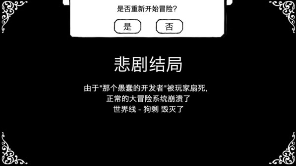 3、悲剧结局:因“那个愚蠢的开发者”被玩家打死,正常的大冒险系统导致世界线崩溃,狗剩也随之毁灭了。