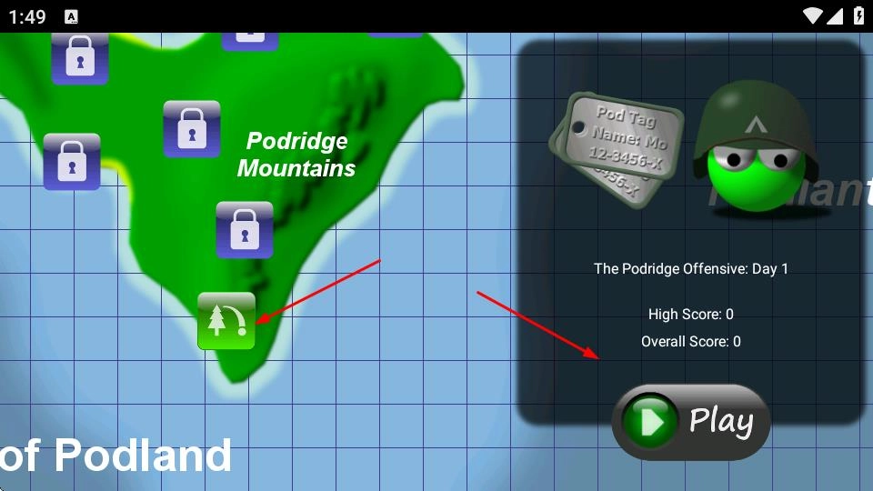 1、启动游戏后,在世界地图界面选择“PodridgeMountains”这类区域关卡,点击“Play”按钮即可开启战斗挑战。