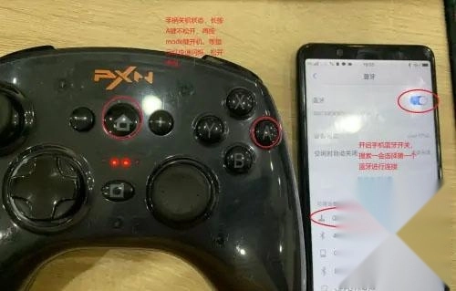 3、当手柄处于关机状态时,先长按A键不松手,接着按下mode键,待指示灯开始快速闪烁后立即松开手指。随后打开手机的蓝牙开关,稍作等待,选择搜索结果中出现的第一个蓝牙设备进行连接;