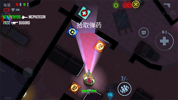 游戏采用俯瞰视角,玩家可通过左手摇杆操控角色移动,右手按键执行换弹、治疗等动作。整体操作较为简易,对新手十分友好。