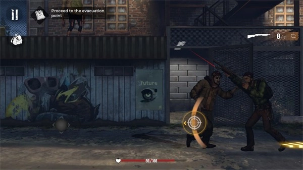 4、遇到僵尸怪物时,点击射击按钮即可发起攻击,使用黄色按钮则能投出手榴弹打击敌人。