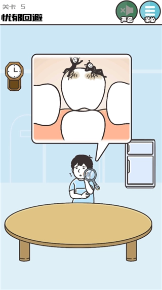 从时钟处获取放大镜,先点击蛀牙下方的新牙,再点击蛀牙使其脱落。