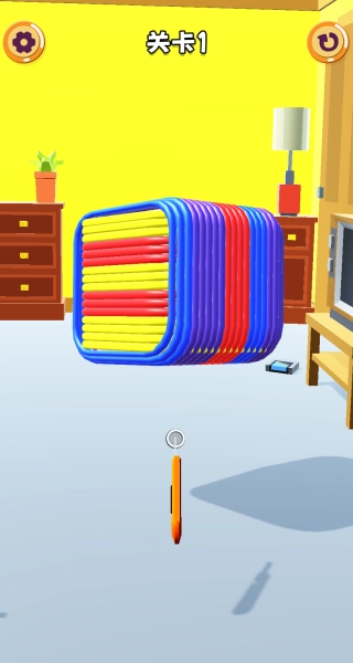 1. 以切割橡皮筋为核心玩法的超休闲解压游戏,目标是清除屏幕上所有缠绕的彩色橡皮筋。
