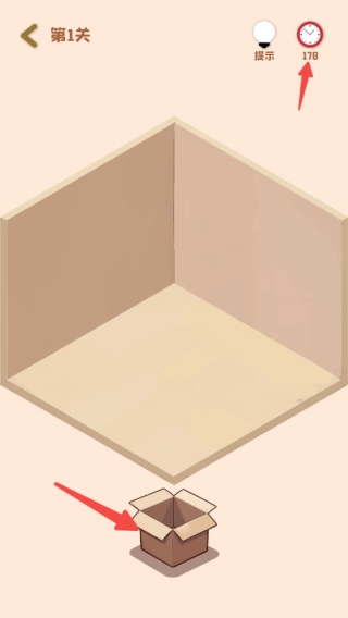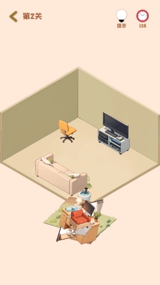 玩家需点击纸箱以获取家具,并在规定时间内完成摆放;若遇到困难,可点击提示按钮获取相关提示。
