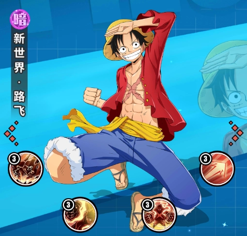 主动技能:橡胶火拳枪。路飞施展出橡胶火拳枪,朝着敌方前排发起攻击,能造成相当于自身450%物理攻击力的伤害,不过单个目标所受伤害最多不超过其自身300%的承受上限。在此基础上,被攻击的敌人还有45%的概率会被附上诅咒状态。