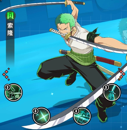 主动技能:千八十烦恼风。在未佩刀的状态下,索隆借助气流与武装色霸气发起攻击,会对敌方后排的随机两个目标造成208%的物理伤害,同时有60%的概率施加法术禁锢效果。如果目标是法师职业,该次攻击的伤害还将提升30%。