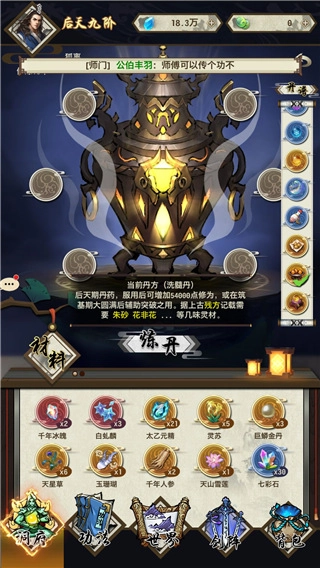 无极丹:服用后修炼速度翻倍,搭配闭关效果更佳。