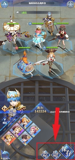接下来就能够调整阵容站位了,玩家既可以点击下方的自动编队功能让系统自动完成阵容调整,也可以手动拖动上方的角色来调整阵容,等调整完成后点击保存按钮就可以了。