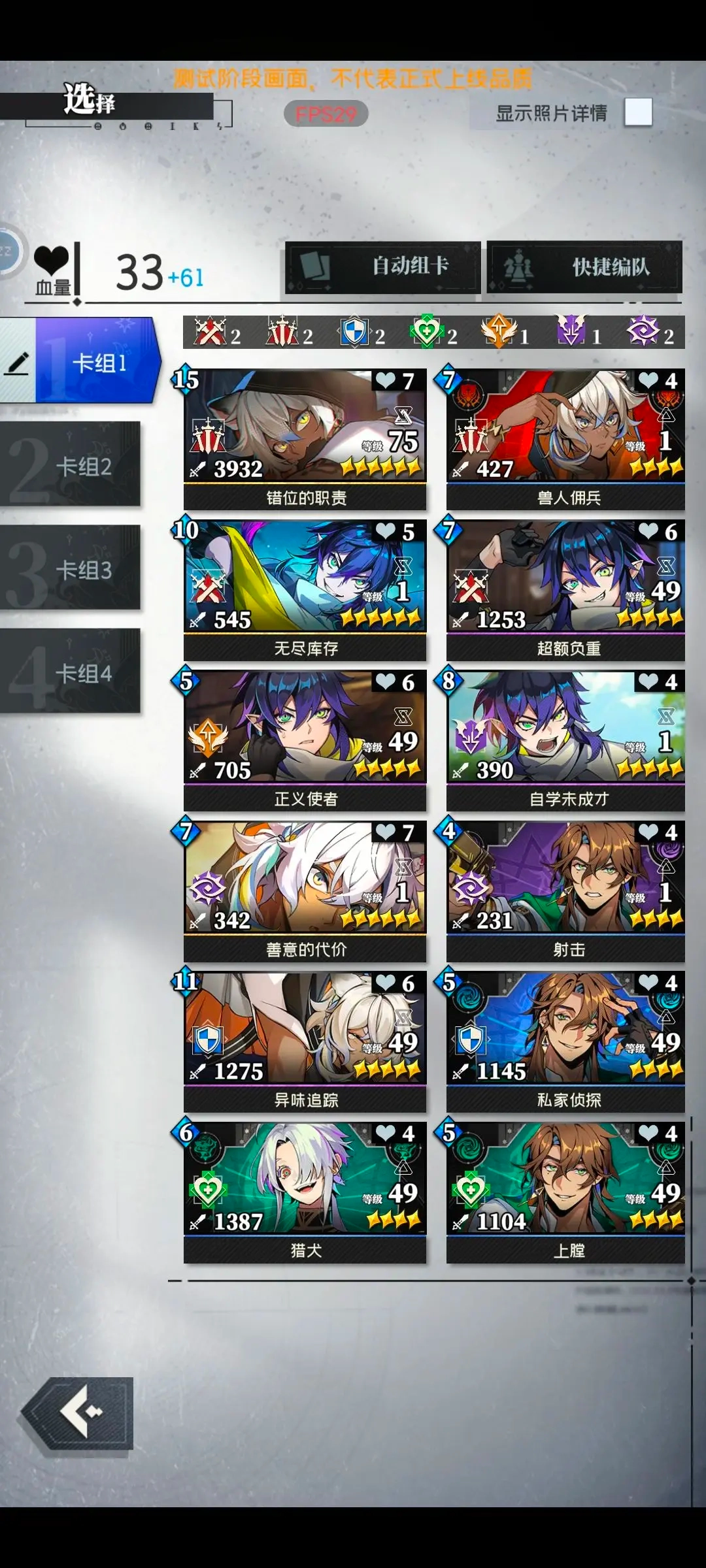 选择兽人这张卡是因为它的技能“好胜意志”是组卡核心;另一张选了私家侦探,五费8盾的属性用起来比较顺手。8费的那张(一张是盾卡,另一张是特殊卡,具体名字记不清了,好像是第一王子或执剑之类的)攻击很高,但费用偏高所以没带,我个人更倾向于优先提升盾奶的费用,这样能腾出更多空间上攻击卡。侦探还有张12费的防御卡,攻击特别高,但我也没选——那张卡攻防兼顾,可惜费用太高了。侦探的很多卡技能都是攻击次数越多越强,属于另一个体系。我觉得功能型的盾奶在后续玩法丰富后肯定会更有用,但前期比如这次测试,资源比较紧张,还是优先培养攻击手比较好。