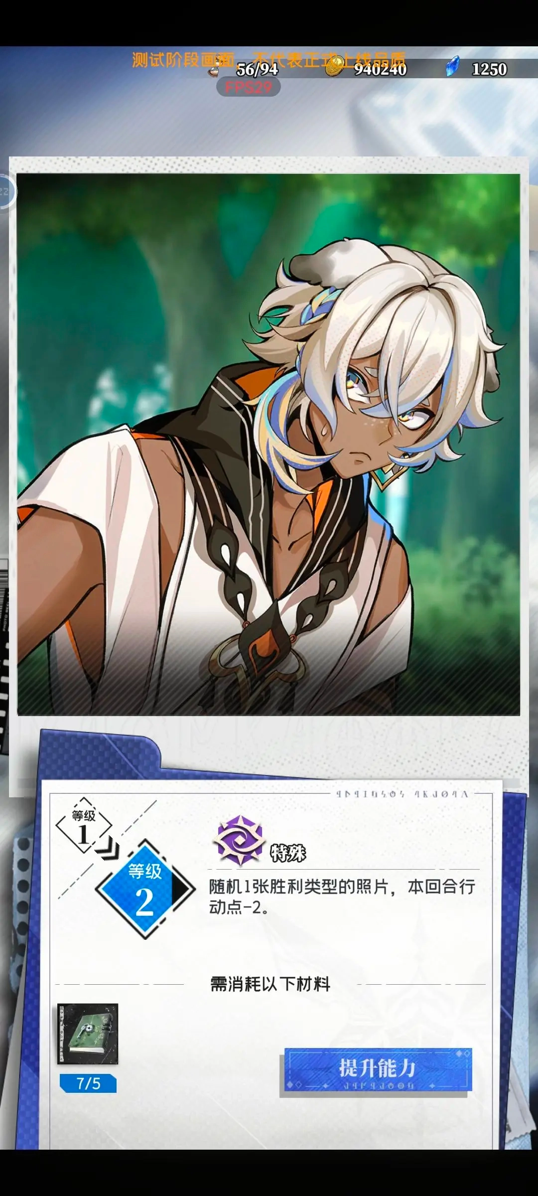 有两个特殊的(卡牌/技能),一个是能额外加一张照片的——我本身是赌鬼,所以特别喜欢这个技能,要不是卡组只能放12张卡,而且手牌还有上限,我真想把三张带加照片效果的一起塞进卡组里;另一个是六星的、能给胜利系卡牌减费的,我个人觉得它是五星开局送的那张同类卡牌的上位替代。