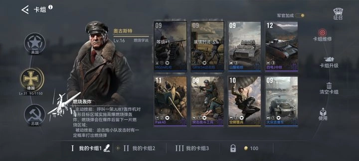苏>美>德(1V1对战中的强度排序,即便在2V2模式下也大致如此)。因此我建议萌新优先选择苏、美阵营,开始游玩前要先进行抽卡,获取那些核心卡牌,这样上手会比较轻松,核心卡的具体内容我会在下面详细说明。