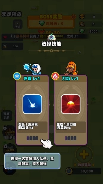 我们可以挑选一名英雄加入队伍,还能选择心仪的技能进行学习与使用,也可以选英雄开启战斗。