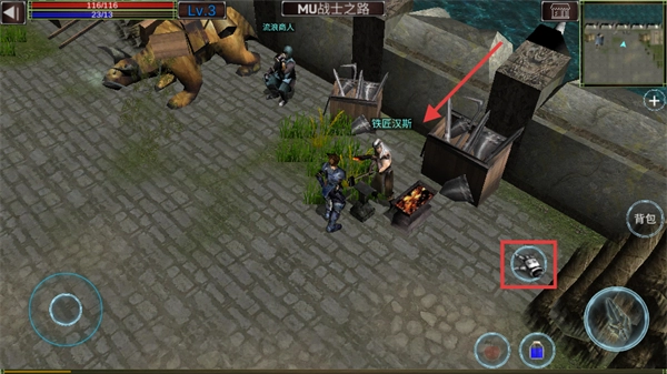 和【铁匠汉斯】进行互动,通过技能按钮来释放技能,在场景中探索以获取资源,提高角色的等级和战斗能力,推动剧情发展。