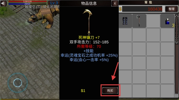 花费【$1】即可购入【死神镰刀+7】,这把武器的双手攻击力区间为【152-185】,使用等级要求是【70】,还能提升幸运属性来辅助战斗。
