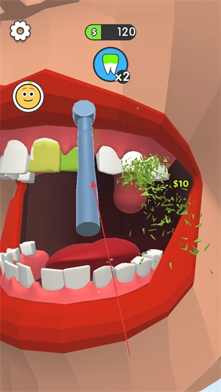 用工具清除患者牙齿上的污垢,每次操作都能获取金币并推进牙齿修复的进度。