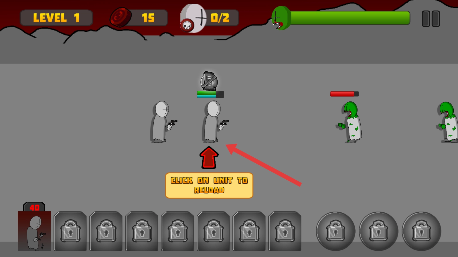 指挥士兵向僵尸开火,攻击能对僵尸产生伤害,慢慢降低它们的战斗能力,守护好我方的阵地。