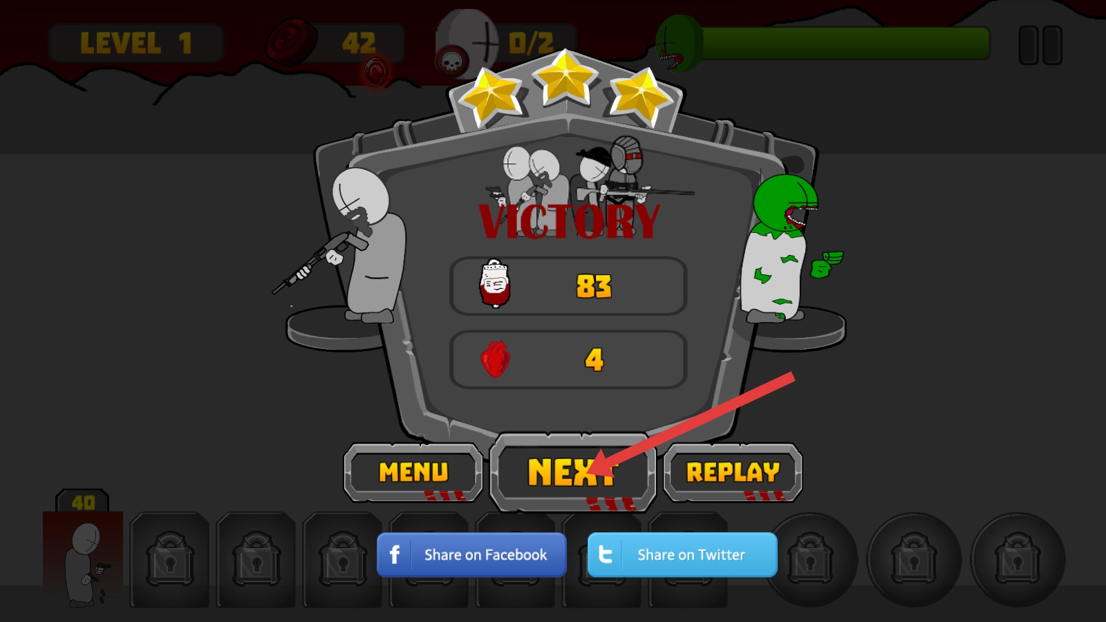 在成功消灭所有僵尸之后,点击NEXT按钮就能进入下一个关卡,接着去挑战实力更强的敌人,以此积累更多的资源与经验。