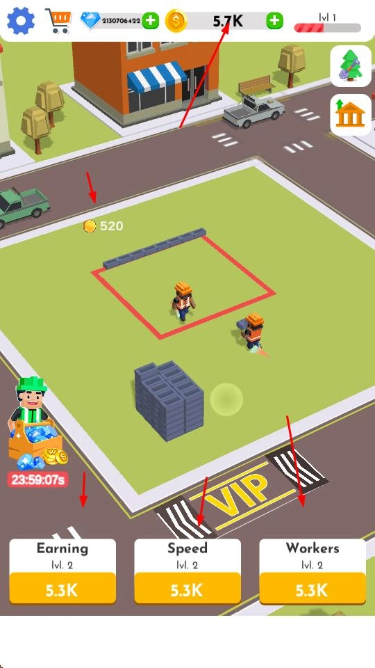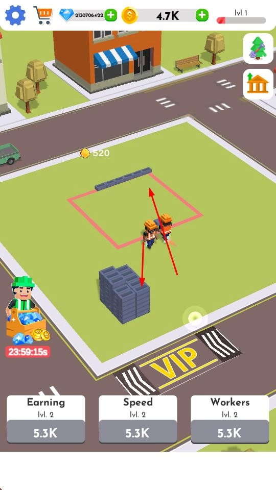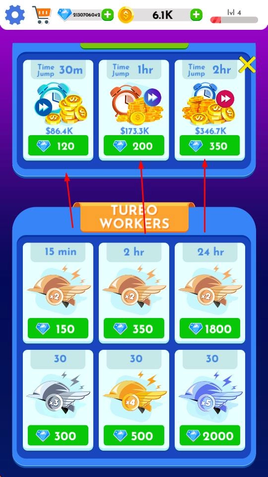 在对应的界面里,你可以花费钻石进行Time Jump以获取金币,还能利用钻石解锁或升级TURBO WORKERS的相关道具,从而提高工人的工作效率,让游戏进度更快推进。