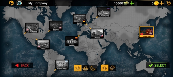 你可以挑选自己想去的地区,游戏里包含多种真实的城内与城外地图,比如美国的旧金山和德克萨斯、南美洲的布宜诺斯艾利斯、欧洲的德国、西班牙、布拉格、圣彼得堡,还有迪拜、上海等地;另外,在下方能选择当前地区一天里的不同时段和天气状况,点击SELECT按钮就可以了。