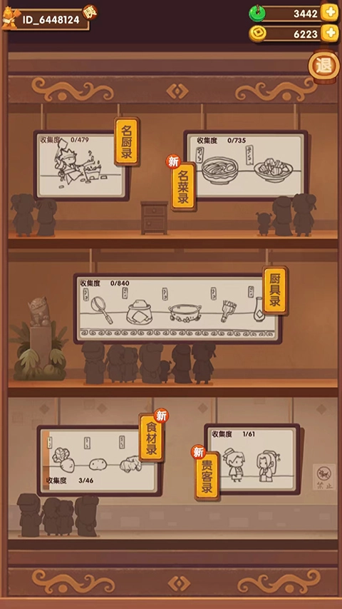 3、进入图鉴界面,可看到名厨录、名菜录、厨具录、食材录和贵客录,可以查看相应的详细说明,