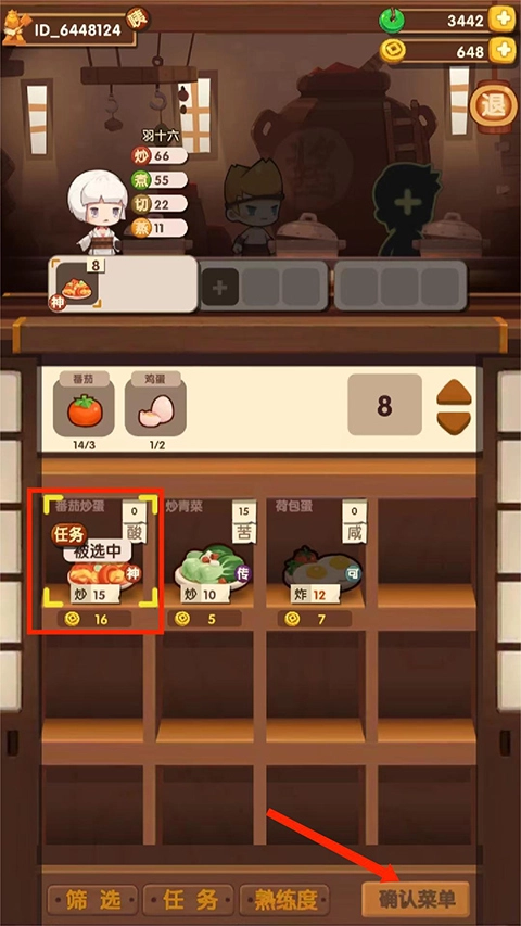 8、进入厨房界面,按要求选择相应的食材后,点击右下角【确认菜单】选项,