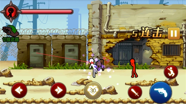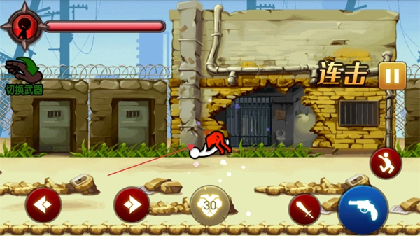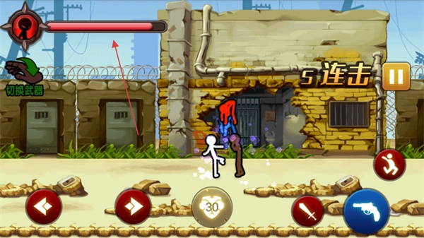 点击右侧剑形或枪形的按钮,就能让火柴人运用武器攻击红色火柴人之类的敌人,还能触发连击效果,从而造成高额伤害。