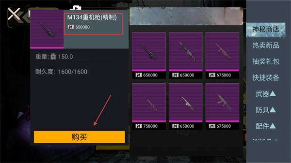 在【神秘商店】里花费【650000】货币购置【M134重机枪-精制】,以此增强战斗时的火力输出水平。