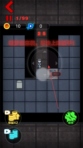 进入挑战模式后,噬梦者会在特定时间出现,你可以通过滑动屏幕的任意位置来操控角色,寻找安全的房间躲避。