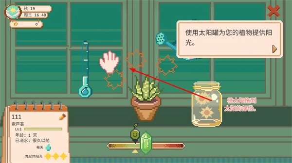 使用太阳罐道具能够提供光照,把它拖动到植物上方,就能让植物的生长成熟过程加快。
